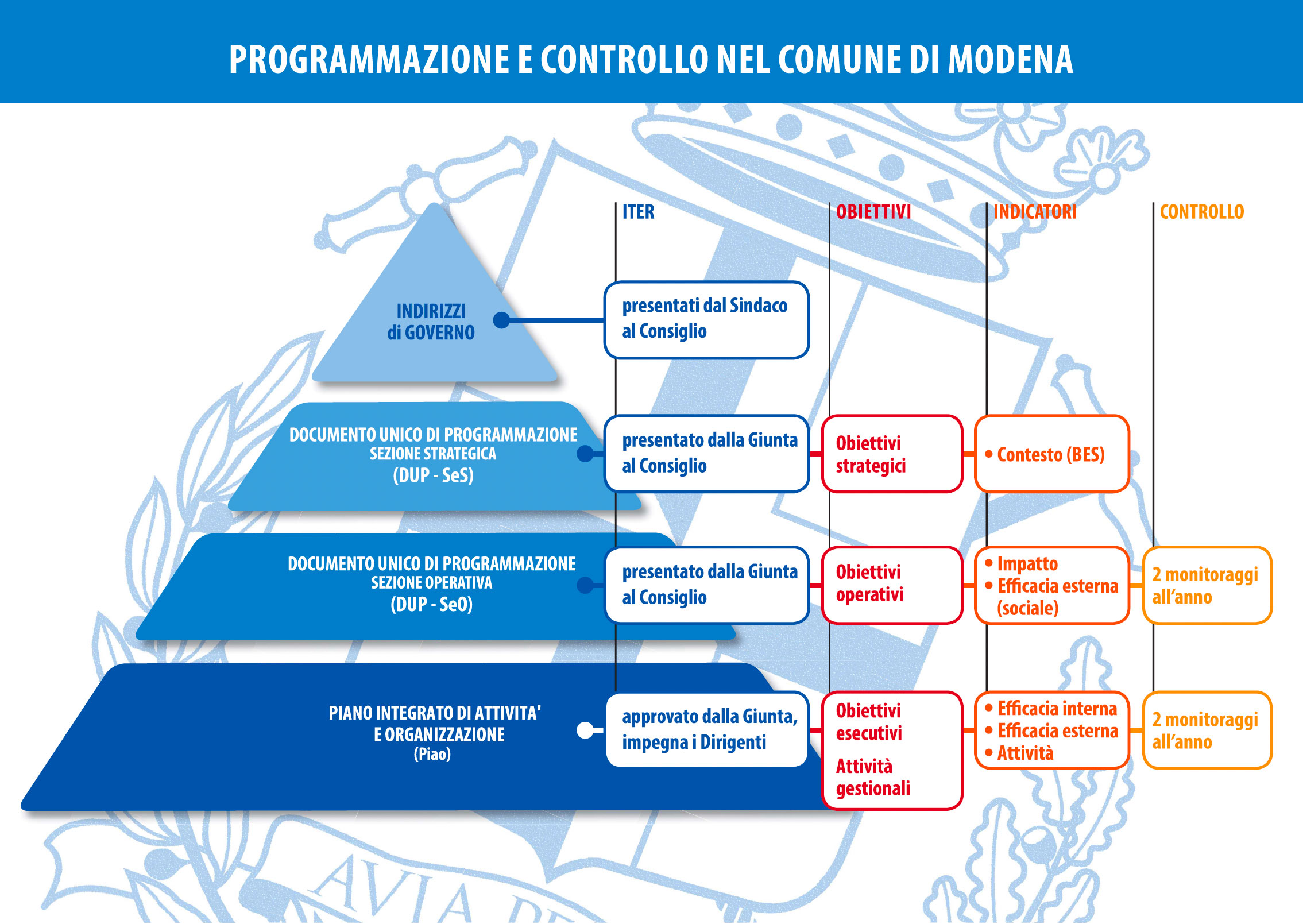 L'"albero" della programmazione fornisce la rappresentazione logico-grafica del sistema di pianificazione con cui si stabiliscono priorità e obiettivi a partire dal programma di mandato del Sindaco fino ad arrivare alla programmazione operativa ed esecutiva.