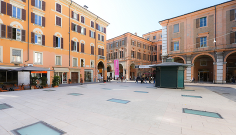 La pavimentazione è oggi modulata su diversi livelli e con pietre di differenti formati, per tutti i 3.400 metri quadrati di superficie: il piano rialzato rivolto alla via Emilia evidenzia la presenza sottostante dell'ex Albergo Diurno ed è rivestito con pietra calcare del tipo 'grolla porfirico' con finitura fiammata, a memoria della vicina "Preda Ringadora".