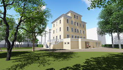 La nuova ala verrà realizzata con un linguaggio architettonico omogeneo all’edificio storico, in modo rispettoso e non impattante, e sarà accostata al corpo principale sull’area di sedime degli ambienti non originari già aggiunti nel passato. Senza togliere importanza alla facciata storica più nobile del lato est, dove sarà ricomposto lo scalone originario di discesa nel parco, il nuovo ingresso sul fronte nord dal viale alberato raggiungibile da via Vaciglio verrà realizzato recuperando lo stesso motivo con l’inserimento del portone in nicchia per consentire la sosta protetta all’entrata e la collocazione al coperto di campanelli e targhe informative. Attorno alla ville non sono previste recinzioni per cui l’accesso al parco rimarrà possibile anche dalla stessa via Vaciglio.