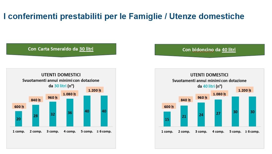 Misurare la quantità di rifiuti prodotti è possibile grazie all'utilizzo delle dotazioni consegnate (gli appositi contenitori in aree servite dal porta a porta o l'utilizzo della tessera/Carta Smeraldo presso i contenitori stradali).