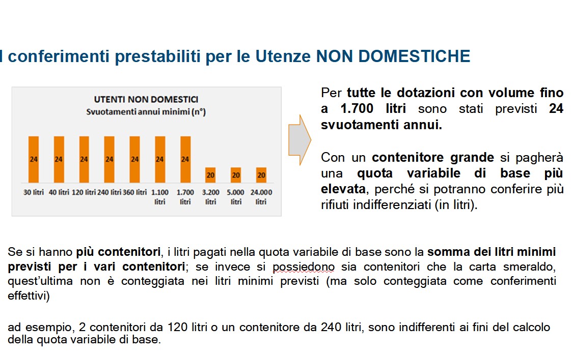 - la quota variabile di base è calcolata in base al numero di litri minimi di rifiuto indifferenziato, stabiliti in funzione della volumetria della dotazione assegnata all’utente. In presenza di più dotazioni, i conferimenti minimi (in litri) saranno determinati sulla volumetria di tutti i contenitori assegnati all’utenza.