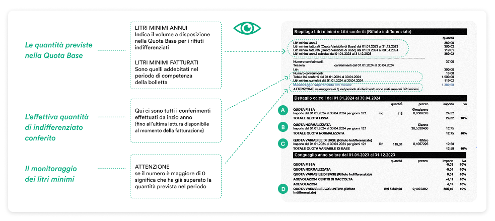 Nella bolletta, la voce Litri minimi annui indica il volume complessivo dei conferimenti spettanti nella Quota Variabile di Base. Per conoscere la situazione dei propri conferimenti di rifiuto indifferenziato è importante guardare la voce Monitoraggio superamento litri minimi.