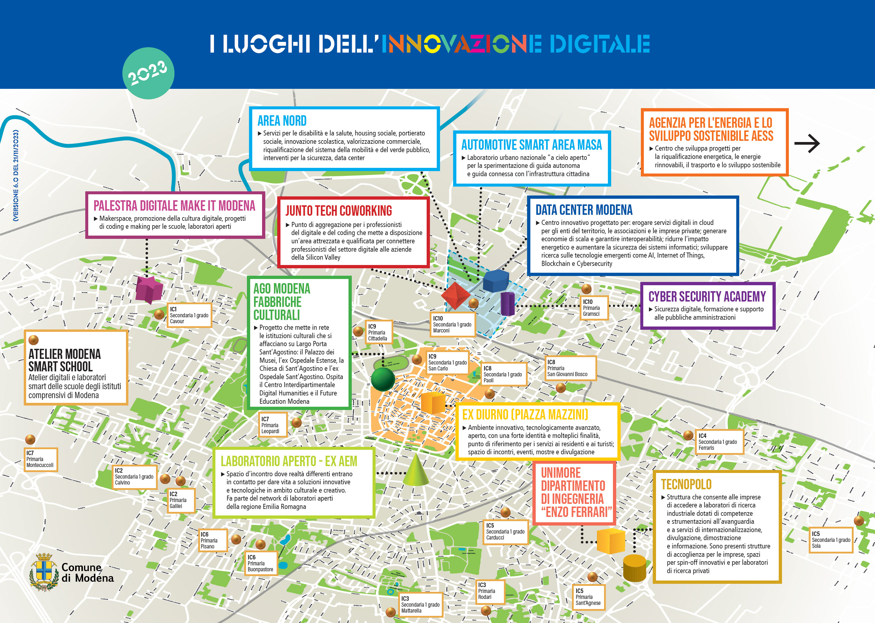 L’innovazione aperta è un nuovo approccio strategico e culturale in base al quale le imprese, per creare più valore e competere meglio sul mercato, scelgono di ricorrere non più e non soltanto a idee e risorse interne, ma anche a idee, soluzioni, strumenti e competenze tecnologiche che arrivano dall’esterno, in particolare da startup, università, istituti di ricerca, fornitori, inventori, programmatori e consulenti. L’obiettivo del Comune di Modena è di applicare questo concetto al proprio contesto, ai propri progetti e favorire la diffusione di questo approccio presso la rete di enti, istituzioni, associazioni e soggetti pubblici e privati che a vario titolo sono in relazione. Fra i luoghi nei quali è possibile fruire esperienze digitali e cercare innovazione aperta ricordiamo il MASA, la Palestra Digitale Make It Modena, Agenzia per l’energia e lo sviluppo sostenibile (AESS), il Tecnopolo di Modena e la rete dei laboratori di Democenter, il Laboratorio Aperto, AGO-FEM-DHMoRe, l’Osservatorio del Buon Gioco, MEMO, la rete dei laboratori, degli atelier e delle biblioteche digitali degli istituti comprensivi e delle scuole di istruzione superiore di modena, i laboratori universitari di UNIMORE, i co-working, gli spazi offerti e gestiti dalle associazioni economiche. Oltre a promuovere e favorire il funzionamento di questi luoghi, il Comune di Modena lavora perché la rete si potenzi e si allarghi con ulteriori elementi diversificati e opera per la concreta collaborazione fra i diversi soggetti. Grazie alla rete dei Luoghi dell’Innovazione, è offerta alla comunità locale o a chi decida di stabilirsi a Modena una molteplicità di esperienza digitali che favoriscono direttamente o indirettamente l’accrescersi del potenziale. Le esperienze sono riconducibili a luoghi fisici, a spazi virtuali e soprattutto alla comunità che le sviluppa e le aggiorna costantemente, un patrimonio inestimabile legato al grande giacimento da valorizzare: le persone.