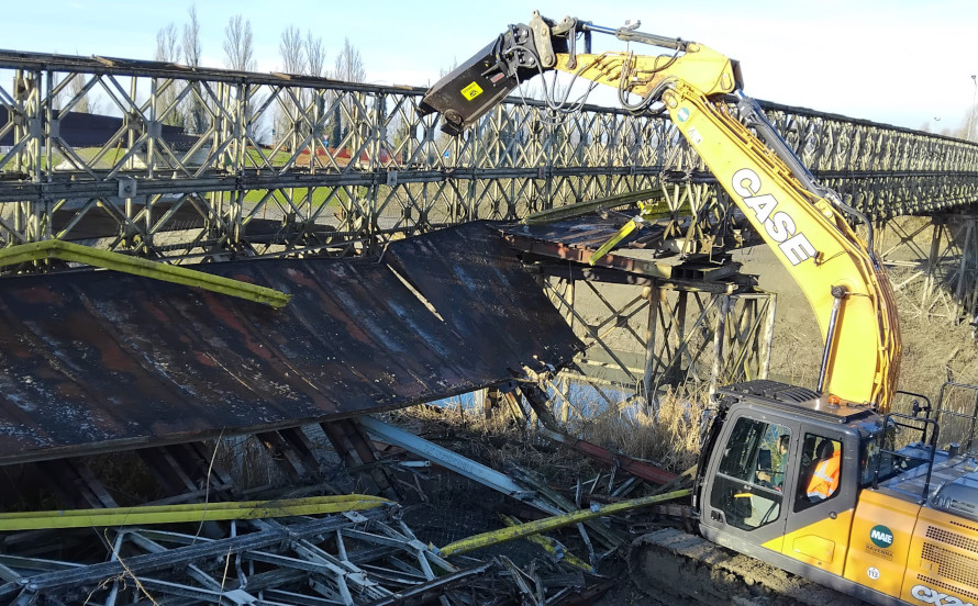 È in corso la demolizione del vecchio ponte dell’Uccellino sul fiume Secchia, tra Modena e Soliera.