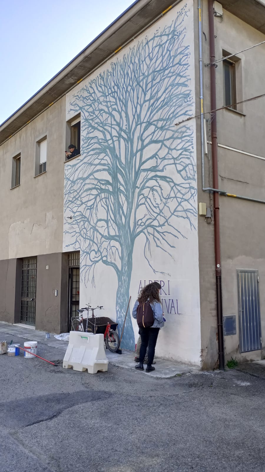 Sulla facciata del padiglione “Progettare con gli alberi”, il grande murale di Simone Ferrarini / CollettivoFX con una Sophora in scala 1:1, che verrà inaugurato domenica 13 alle ore 12 in presenza di una delegazione di ciclisti reggiani che arriverà al Festival in bicicletta, percorrendo un percorso ciclabile non ufficiale che collega le due città emiliane, passando per Rubiera.