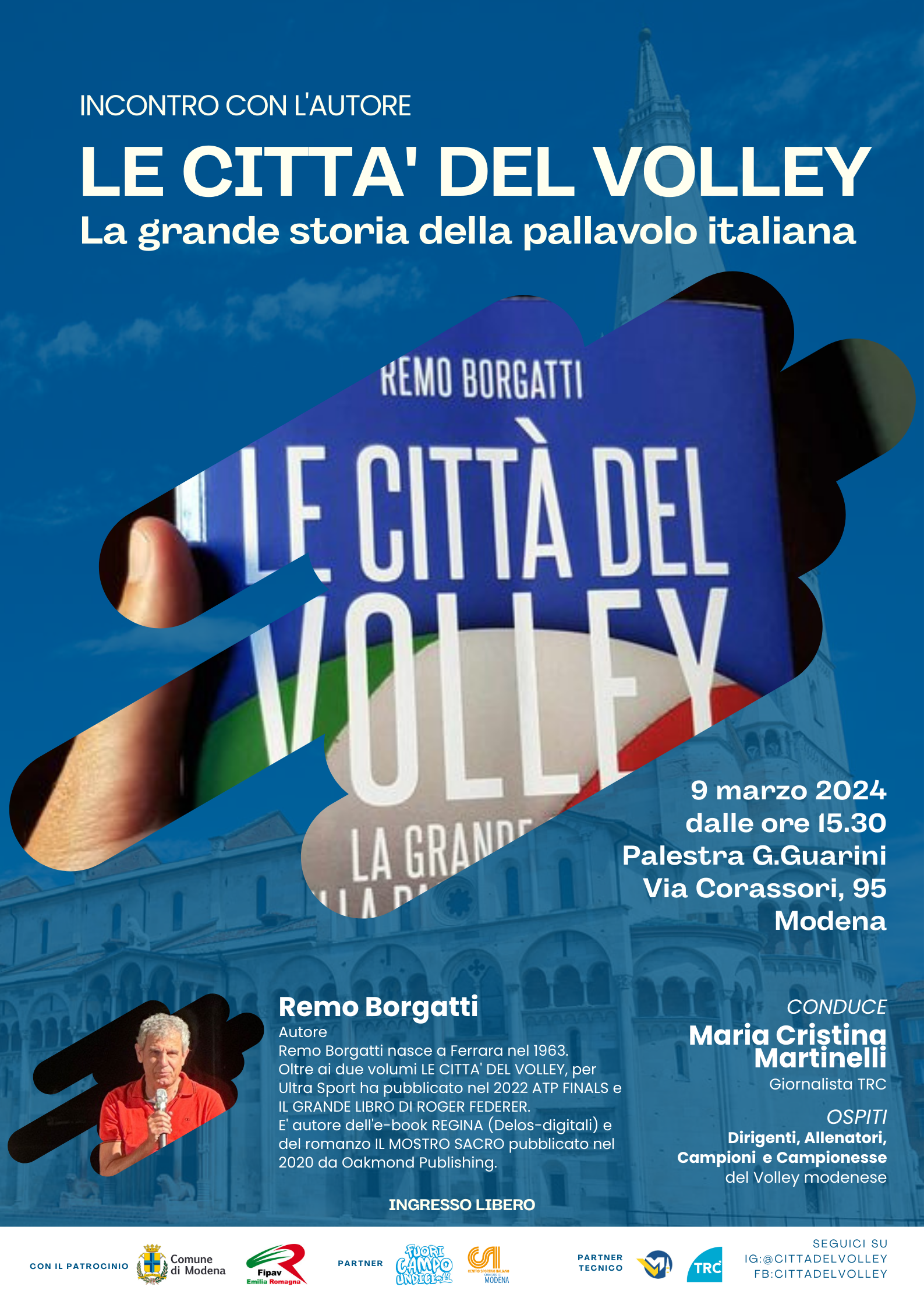 Sabato 9 marzo alle ore 15.30, presso la palestra Guarini in viale Corassori 95, si terrà un incontro con lo scrittore Remo Borgatti, autore del libro "Le città del volley - la grande storia della pallavolo italiana".