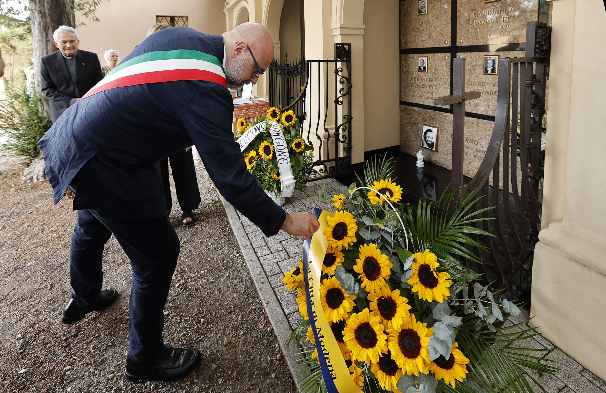 Due splendide ceste di girasoli, i fiori che il celebre tenore amava tanto, sono state deposte dal sindaco di Modena, Massimo Mezzetti, e dalla vicesindaca di Castelnuovo Rangone, Daniela Sirotti Mattioli.