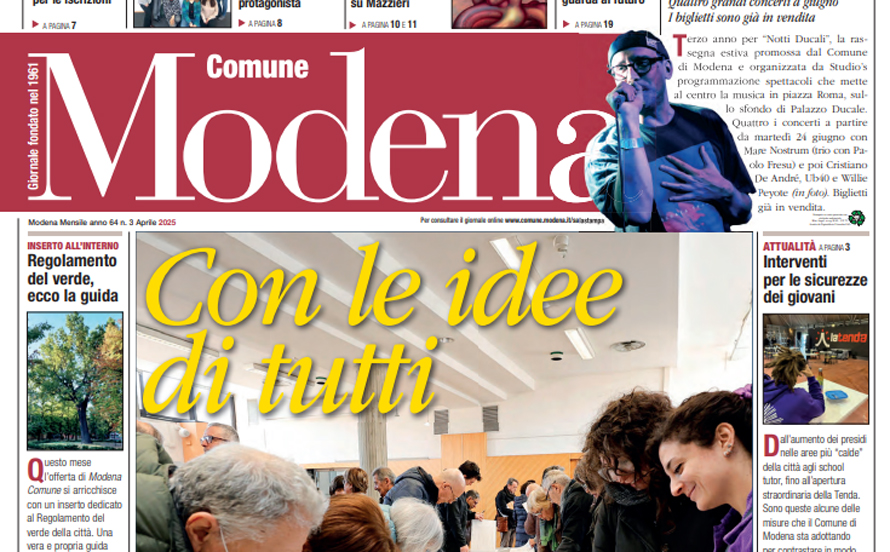è il titolo di copertina del numero di aprile di “Modena Comune”, il mensile dell’Amministrazione comunale che dedica l’immagine principale all’incontro pubblico di “restituzione” del percorso partecipato “Sei la mia città. Rigeneriamo Modena”, con al centro le 115 proposte dei cittadini, oltre metà di queste indicazioni saranno alla base di un Avviso pubblico per imprenditori; le altre potranno essere realizzate dall’Amministrazione.
