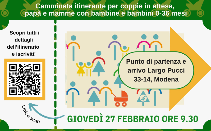 Giovedì 27 febbraio, dalle 9.30 alle 12, camminata itinerante in zona Crocetta/Sacca per coppie in attesa, papà e mamme con bambine e bambini 0-36 mesi.