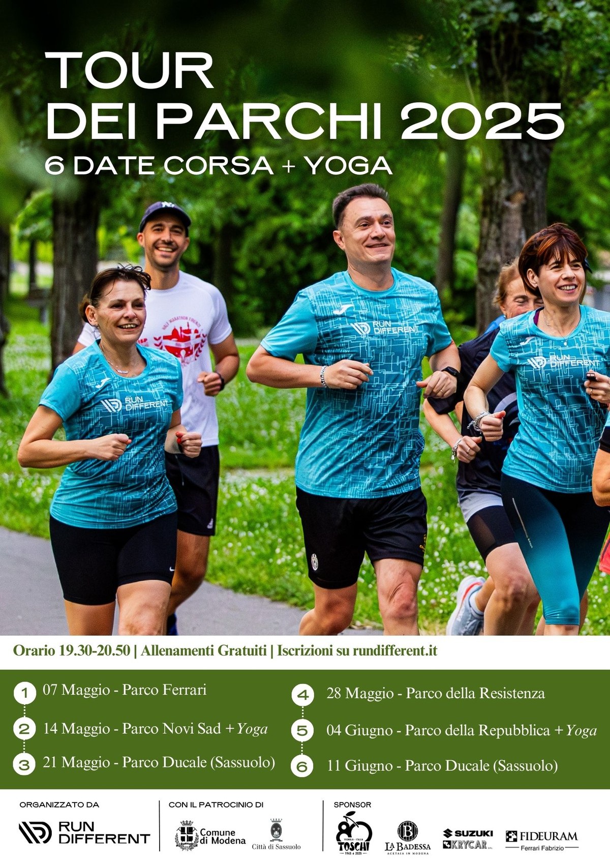 Prende il via mercoledi 7 maggio la quarta edizione della manifestazione "Tour dei Parchi" organizzata dalla community di runners “Run Different” che si svolgerà nei mesi di maggio e giugno nei parchi e nelle aree verdi di Modena e, in aggiunta quest'anno, anche presso il Parco Ducale di Sassuolo.