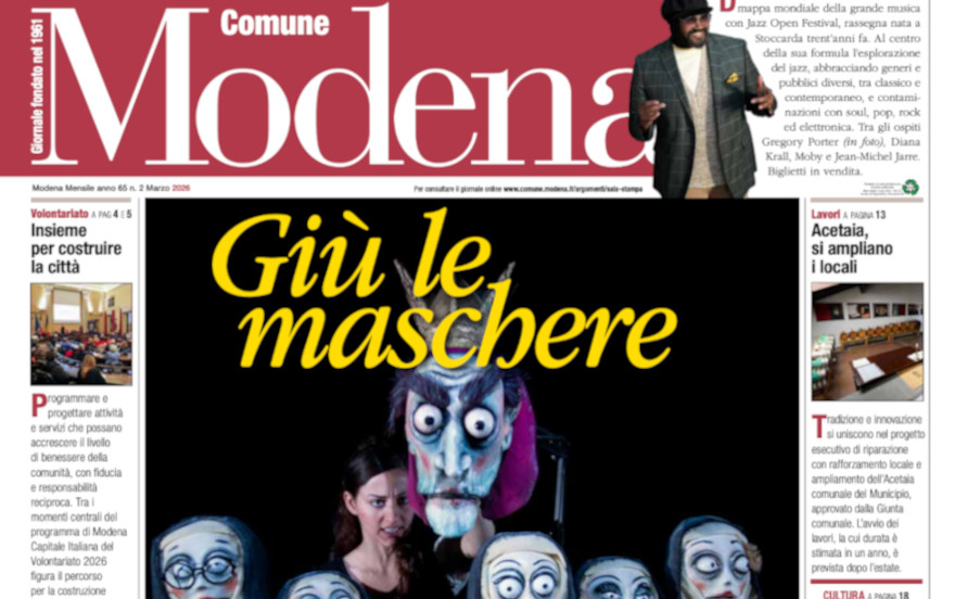 La copertina, dal titolo “Giù le maschere”, è dedicata alla Giornata internazionale della donna: diverse le iniziative in città, tra cui, l’8 marzo, allo Storchi, lo spettacolo “La Semplicità ingannata”, con voci femminili dal passato che rivendicano la propria libertà contro ipocrisie e convenzioni.