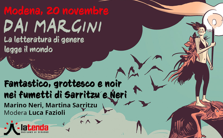 Mercoledì 20 novembre, alle 21, terzo e ultimo appuntamento con “Dai Margini – La letteratura di genere legge il mondo”, la rassegna di incontri curati da Natalia Guerrieri e Giorgio Raffaelli che propone una panoramica sulla letteratura di genere. La serata dal titolo “Fantastico, grottesco e noir nei fumetti di Sarritzu e Neri” avrà come ospiti Marino Neri e Marina Sarritzu. Marino Neri, dalle atmosfere sospese dell’Incanto del parcheggio multipiano al clima sognante di Cosmo, per arrivare ai toni noir della Tempesta, ha saputo reinventare con originalità le atmosfere dei vari generi per restituire, con le sue opere, uno stile unico e autoriale. Lo stesso fa la fumettista Martina Sarritzu, con i racconti di Sciame, con il progetto collettivo A.M.A.R.E. o con Vacanze in scatola, tra gibboni e castelli medievali. Con la moderazione dello scrittore Luca Fazioli, Neri e Sarritzu parleranno di un lavoro che mette insieme testo e narrazione visiva andando oltre i limiti delle categorie stilistiche.