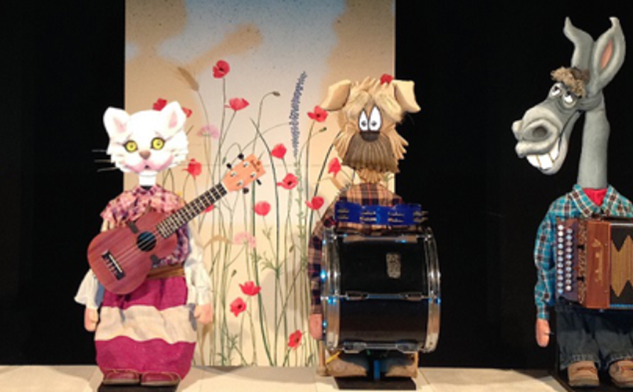 Sulla scena un campo di papaveri a perdita d’occhio, Brema all’orizzonte e pupazzi che suonano (veramente!) meravigliose musiche della tradizione folk francese. Un asino che suona l’organetto, un cane con la grancassa, un gatto con l’ukulele e un gallo alle prese con una cornamusa. Ma tutte le storie, anche le più belle, prima o poi diventano cattive, amare e pericolose: i quattro amici certo non potevano sapere che quella era la casa dei Briganti! Ma anche i briganti suonano… cosa? La chitarra elettrica!