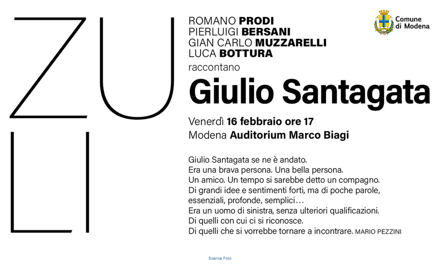 Gli amici lo hanno sempre conosciuto come Zuli ed è questo il titolo scelto per l’iniziativa in ricordo di Giulio Santagata, economista, parlamentare e ministro nell’ultimo governo Prodi scomparso il 5 gennaio a 74 anni, che si svolge venerdì 16 febbraio, alle 17, all’Auditorium Marco Biagi a Modena. All’appuntamento pubblico, promosso dal Comune di Modena insieme alla famiglia, partecipano il sindaco Gian Carlo Muzzarelli, l’ex presidente del Consiglio e della Commissione europea Romano Prodi e l’ex ministro Pierluigi Bersani che dialogheranno con il giornalista Luca Bottura.