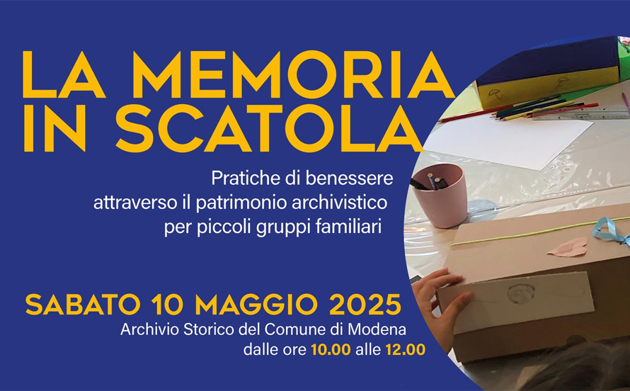 “La memoria in scatola” è un laboratorio, gratuito, in programma sabato 10 maggio, dalle 10 alle 12, all’Archivio Storico del Comune di Modena. L’iniziativa è rivolta ai bimbi (dai 6 anni in su) e alle loro famiglie, con l’obiettivo di sperimentare pratiche di benessere per piccoli gruppi familiari attraverso il patrimonio archivistico.