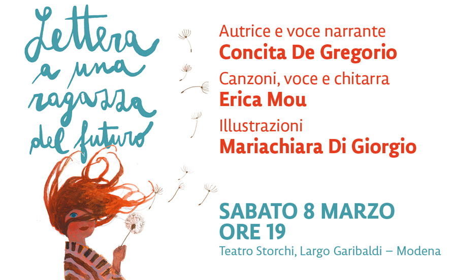 In occasione della Giornata Internazionale della Donna, il Comune di Modena - Pari opportunità ed Emilia Romagna Teatro ERT / Teatro Nazionale presentano "Lettera a una ragazza del futuro", un reading scenico che unisce letteratura, musica e illustrazione.
