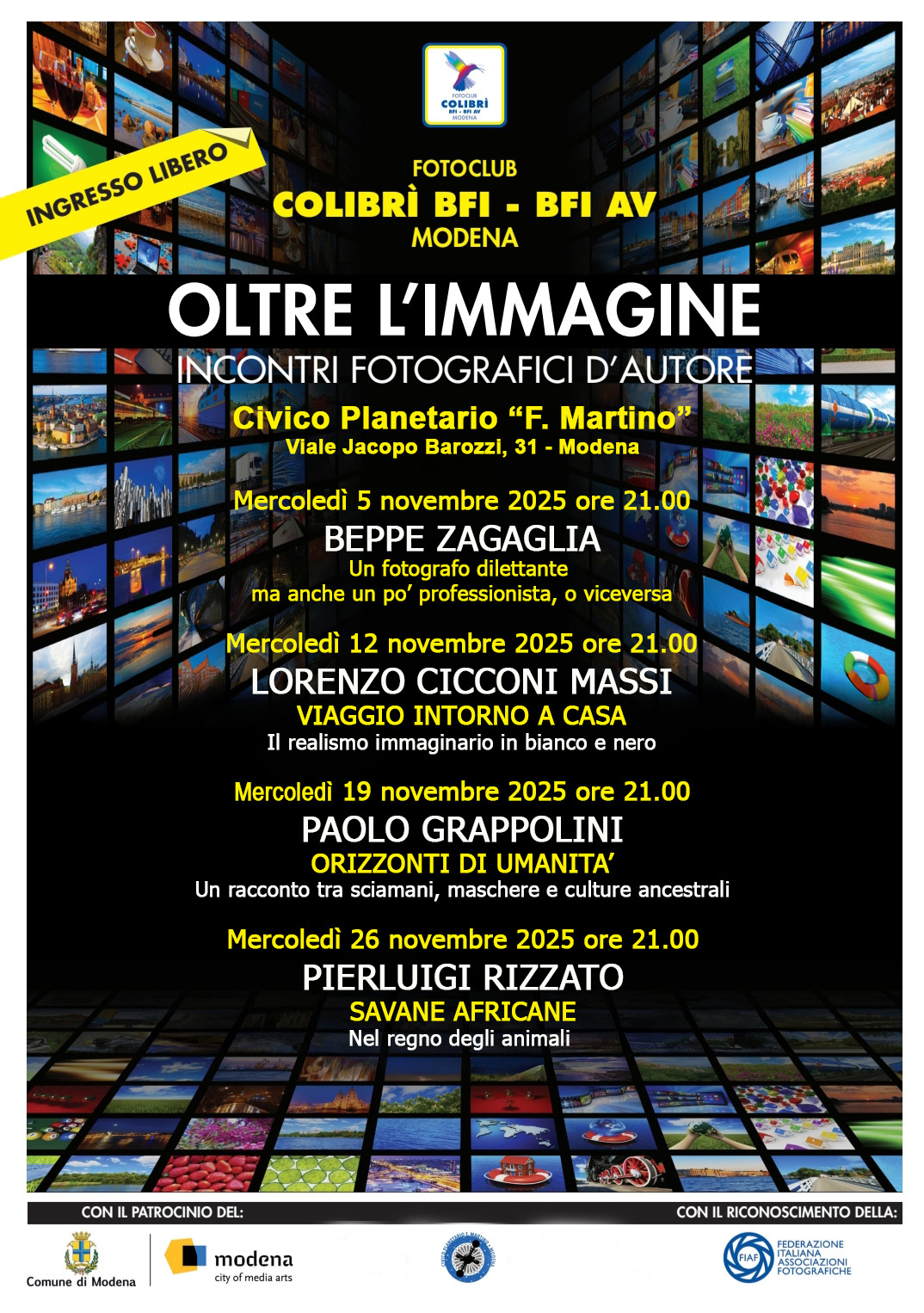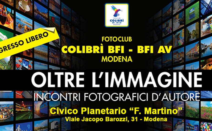 Si rinnova anche quest'anno l'appuntamento con la rassegna fotografica "Oltre l 'immagine , incontri fotografici d'autore", organizzata dal Fotoclub Colibrì ogni mercoledì del mese di novembre, al Civico Planetario F. Martino di Modena.